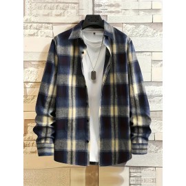 Big Plaid Pattern Men's Retro Casual Long Sleeve Lapel Shirt With Pocket Design, Fall Winter Outdoor